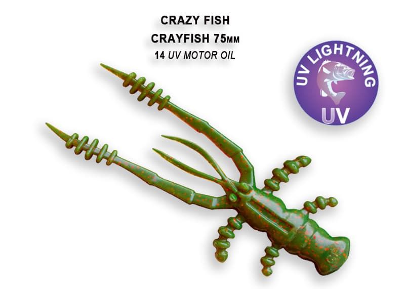 Crazy Fish Crayfish 75 мм — это имитация рачка, который является объектом охоты не только хищной, но и мирной рыбы. Его тонкие клешни и боковые лапки начинают соблазнительно двигаться при малейшем импульсе кончиком удилища. А лучшие расцветки и аттрактанты Crazy Fish делают его неотразимым для окуня, щуки и судака.