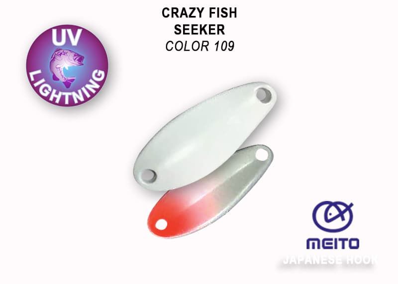 Crazy Fish Seeker — маленькая колеблющаяся блесна каплевидной формы весом 2.5 грамма. Хорошо летит благодаря смещенному к хвосту центру тяжести. Стабильно выдаёт широкие колебания как на течении так и в стоячей воде, и подходит для ловли всех видов хищных рыб. Seeker красиво и эффективной играет на падении, поэтому советуем добавлять в проводку паузы для «осыпания» блесны.