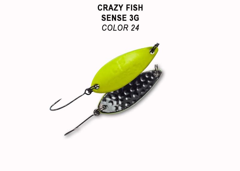 Crazy Fish Sense — небольшая колеблющаяся блесна весом 3 грамма с относительно широки телом и широкой, размашистой, низкоамплитудной игрой. Это позволяет делать медленные проводки и хорошо собирать рыбу с более дальних дистанций. На падении блесна привлекательно «осыпается», поэтому равномерные проводки очень полезно чередовать с паузами, которые могут быть либо просто сбоем приманки и коротеньким падением, либо давать приманке сыпаться до самого дна.