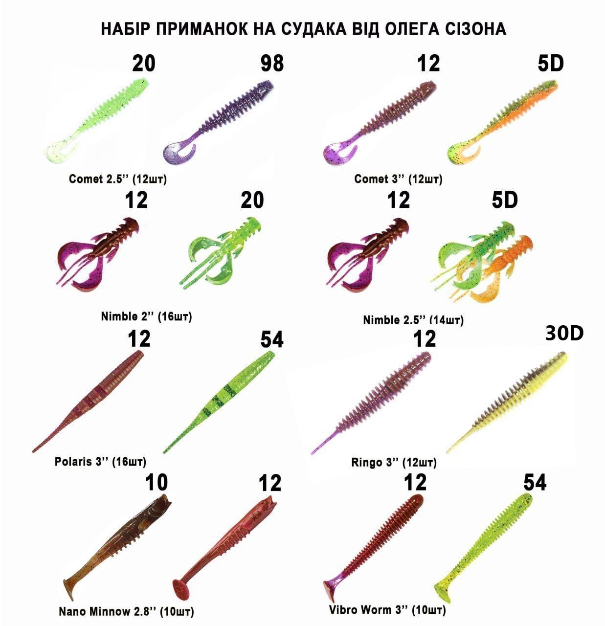 Vibro Worm 3”: приманка для ситуації коли все вже знайдено, клює чудово, треба пакувати. Чудово працює на течії. Найефективніша приманка, бо відсутні вимоги до проводки та монтажу: звичайне подвійне підкидання на шарнірі вагою 8 - 15 грамів дає максимальну кількість клювань судака будь-якого розміру. За відсутності корчів рекомендовано подвійний гачок. Кольори: 54 завжди, 12 для дуже прозорої води.