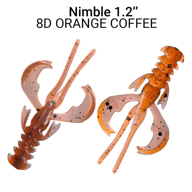 Crazy Fish Nimble 1.2” — трехсантиметровый рак с активными клешнями, которые после попадания в водоём сразу начинают попеременно или синхронно колебаться даже во время одной проводки в зависимости от потоков воды. Этот эффект оживляет приманку, провоцирую хищника на атаку. Хаос в движениях убегающей добычи, натуралистичность, беспрерывная размашистая работа без сбоев — в этом преимущество «Нимбла» перед виброхвостами и слагами в аналогичном размере.