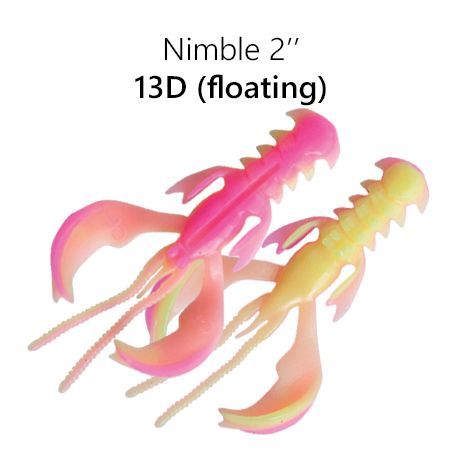 Crazy Fish Nimble 2” — пятисантиметровый рак с активными клешнями, которые после попадания в водоём сразу начинают попеременно или синхронно колебаться даже во время одной проводки в зависимости от потоков воды. Этот эффект оживляет приманку, провоцирую хищника на атаку. Хаос в движениях убегающей добычи, натуралистичность, беспрерывная размашистая работа без сбоев — в этом преимущество «Нимбла» перед виброхвостами и слагами в аналогичном размере.