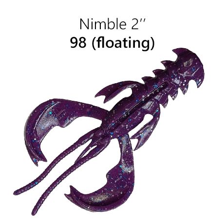 Crazy Fish Nimble 2” — пятисантиметровый рак с активными клешнями, которые после попадания в водоём сразу начинают попеременно или синхронно колебаться даже во время одной проводки в зависимости от потоков воды. Этот эффект оживляет приманку, провоцирую хищника на атаку. Хаос в движениях убегающей добычи, натуралистичность, беспрерывная размашистая работа без сбоев — в этом преимущество «Нимбла» перед виброхвостами и слагами в аналогичном размере.