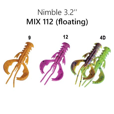Crazy Fish Nimble 3.2” — рак с активными клешнями, которые после попадания в водоём сразу начинают попеременно или синхронно колебаться даже во время одной проводки в зависимости от потоков воды. Этот эффект оживляет приманку, провоцирую хищника на атаку. Хаос в движениях убегающей добычи, натуралистичность, беспрерывная размашистая работа без сбоев — в этом преимущество «Нимбла» перед виброхвостами и слагами в аналогичном размере. Такк же данная модель выполнена их екстра плавающего материала.