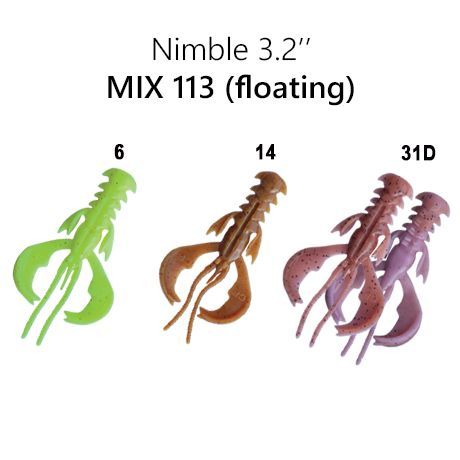 Crazy Fish Nimble 3.2” — рак с активными клешнями, которые после попадания в водоём сразу начинают попеременно или синхронно колебаться даже во время одной проводки в зависимости от потоков воды. Этот эффект оживляет приманку, провоцирую хищника на атаку. Хаос в движениях убегающей добычи, натуралистичность, беспрерывная размашистая работа без сбоев — в этом преимущество «Нимбла» перед виброхвостами и слагами в аналогичном размере. Такк же данная модель выполнена их екстра плавающего материала.