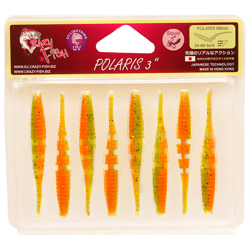 Crazy Fish Polaris –— одна из лучших пассивных приманок. Благодаря геометрии тела приманки в воде она совершает невероятно реалистичные движения, напоминающие насекомое, личинку или червя. Достаточно легкого импульса кончиком спиннинга и Polaris оживает. Её игра соблазняет практически всех наших рыб, как хищных так и мирных! Polaris незаменим при охоте на окуня. Приманку можно использовать как на классическом монтаже с джиг-головкой, так и на шарнире или отводном поводке.